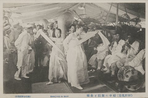 この「朝鮮風俗」という絵葉書、かなり多量に出回ったようだ。今回は「船中の舞踏と奏楽」とタイトルがついている。なぜ、船中なのか理解しがたいが、「関釜連絡船」の可能性が高い。白い衣装。日本でいう「布舞」のようだ。<追記>この二、三日、インターネット上の韓国メディアの「報道」に食手が伸びない。記事が面白くないからだ。経済ネタが多すぎる。外交通商部長官柳明桓のつまらない世迷言を取り上げた所以だ。失礼。