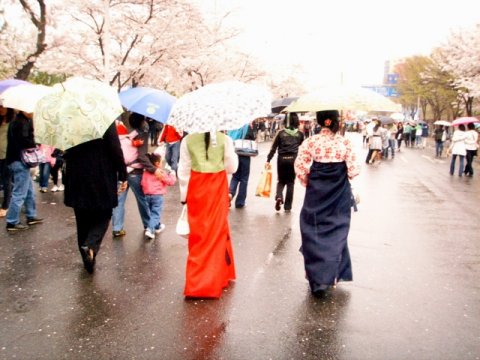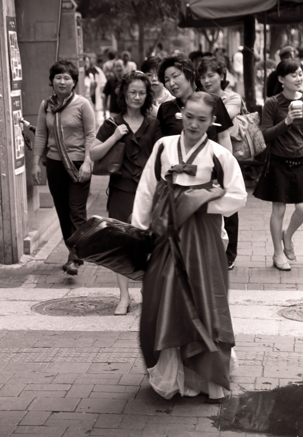 戸外での韓服姿です。上の写真は、チマを腰に巻いています。雨中ということでなく、チマが広がらないように腰に巻いて歩く人が多いですね。下の写真は、韓服の人を物珍しそうに見ている人たちの視線に注意。普段の韓国では、韓服が珍しいのでしょう。