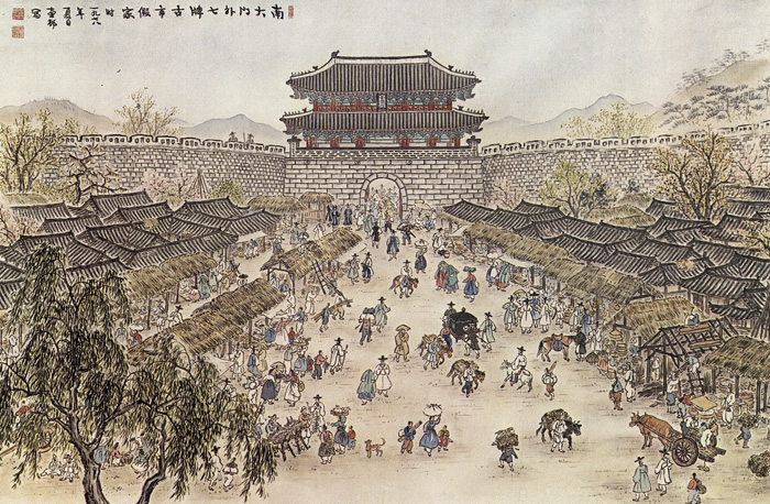 清潔な都、上品な言葉遣い、華麗な服装の女性たち・・・全部嘘。そうであって欲しかったという願望が絵に表れている。今は無き、漢城南大門の図。1978年作成のようだ。2 枚の写真は、大変貴重。